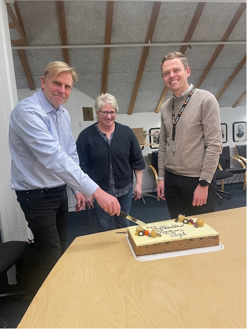 Trygg trafikk, respresentert ved Espen Aarnes og David Tofthagen, var på besøk med kake og blomster i førre veke.