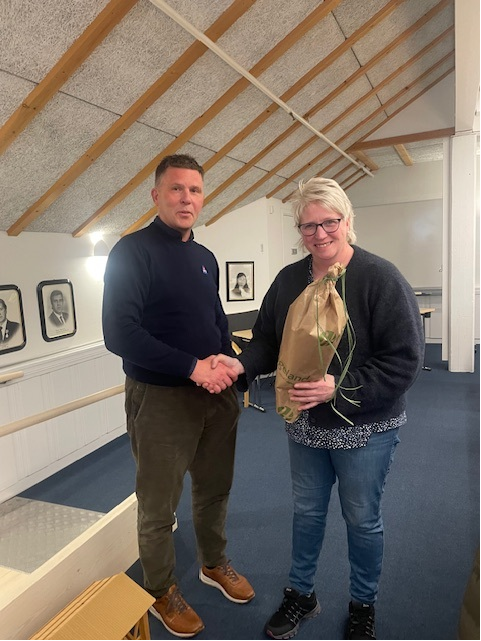 David Tofthagen i Trygg trafikk overrekte blomar til resertifiseringsansvarleg Gunn Oddveig Rindhølen